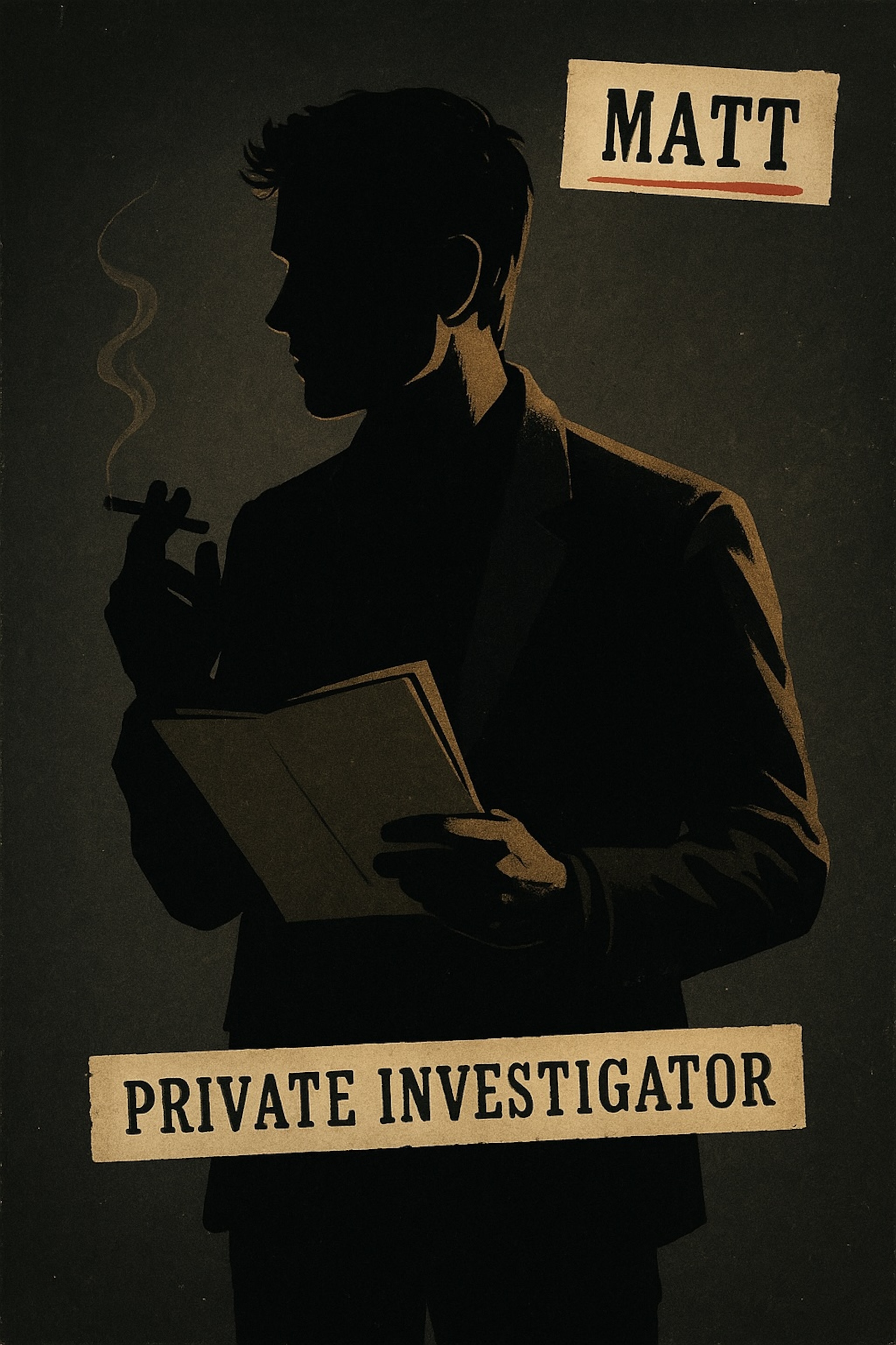 Private investigator by trade. Professional observer by nature. Matthew Holmes (aka Matt) prefers files to people and facts to speculation — unless, of course, the people live in his flat and keep stumbling into murder plots. With a camera in one hand and a theory in the other, Matt rarely says more than he has to. But when it comes to keeping the trio grounded, his silence speaks volumes.
